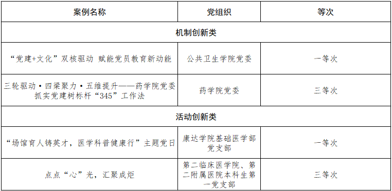 近年来,学校党委深入学习贯彻习近平新时代中国特色社会主义思想,全面贯彻落实新时代党的建设总要求和新时代党的组织路线,聚焦落实立德树人根本任务,着力加强基层党组织建设。各基层党组织紧密围绕学校中心工作,不断创新党建工作理念思路、制度机制和方式方法,着力在党建品牌凝练、典型培树创建、经验示范推广等方面出新招、见实效,党建工作标志性成果持续涌现。学校党委将进一步完善高质量党建工作体系,巩固和推出更多具有示范引领作用的党建创新成果,扎实推进“抓党建”与“促发展”深度融合,为加快建设特色鲜明的“双一流”医科大学夯实组织保障、注入强劲动能。